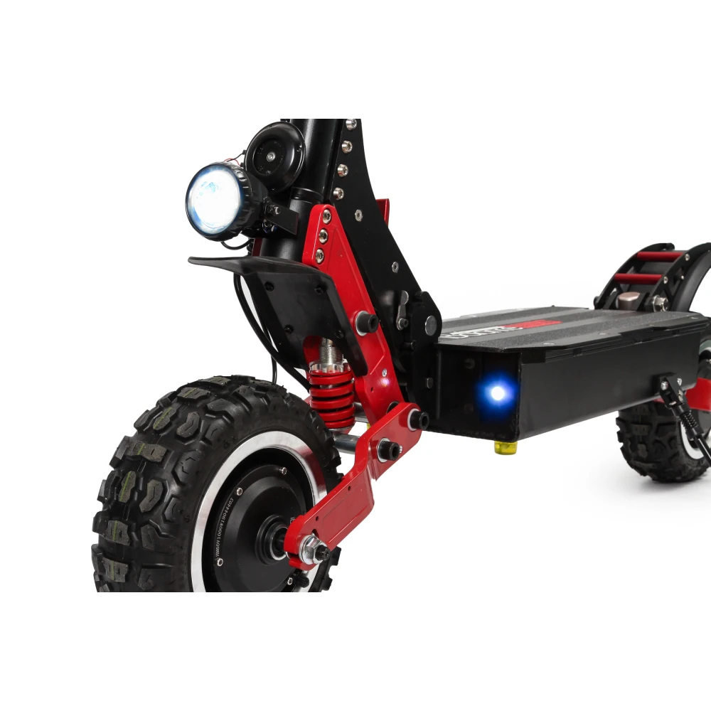 Повышенная проходимость агрегата порадует любителей загородных поездок. Он преодолевает подъемы в 45 градусов, подъемистый и резвый. Быстро набирает скорость, максимальные показатели которой составляют 60 км/ч. Полный привод способствует маневренности электросамоката. При спокойном передвижении можно отключить одно мотор-колесо.