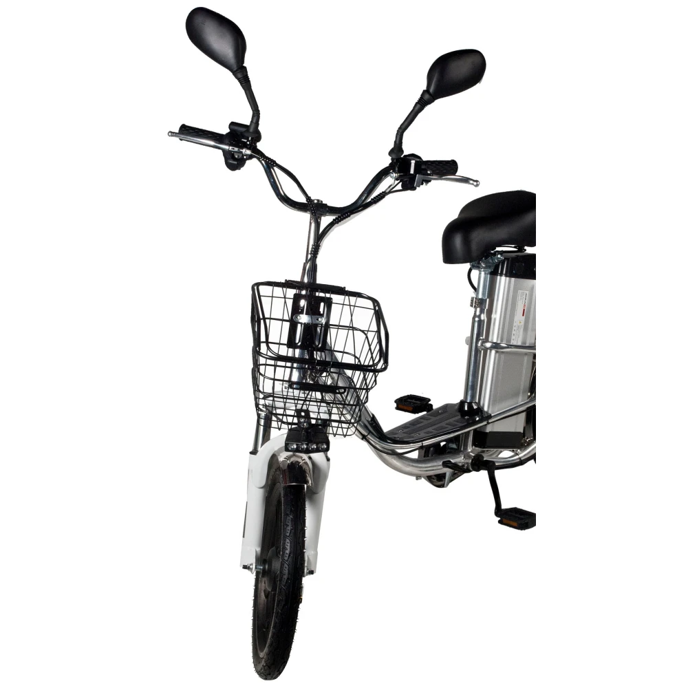 Модель оснащена надежным двигателем мощностью 500 Вт, позволяющим развивать скорость 50 км/час. Техника выполнена в лаконичном дизайне, имеет вместительную корзинку на руле для удобства поездок. Масса транспортного средства составляет 33 кг, выдерживает максимальную грузоподъемность 200 кг. Мощная батарея позволяет преодолевать расстояния на одном заряде 100 км. Фирменная тормозная система состоит из задних гидравлических и передних барабанных тормозов. Одним из значительных преимуществ электровелосипеда является наличие удобного багажника и сидения с оригинальным покрытием.