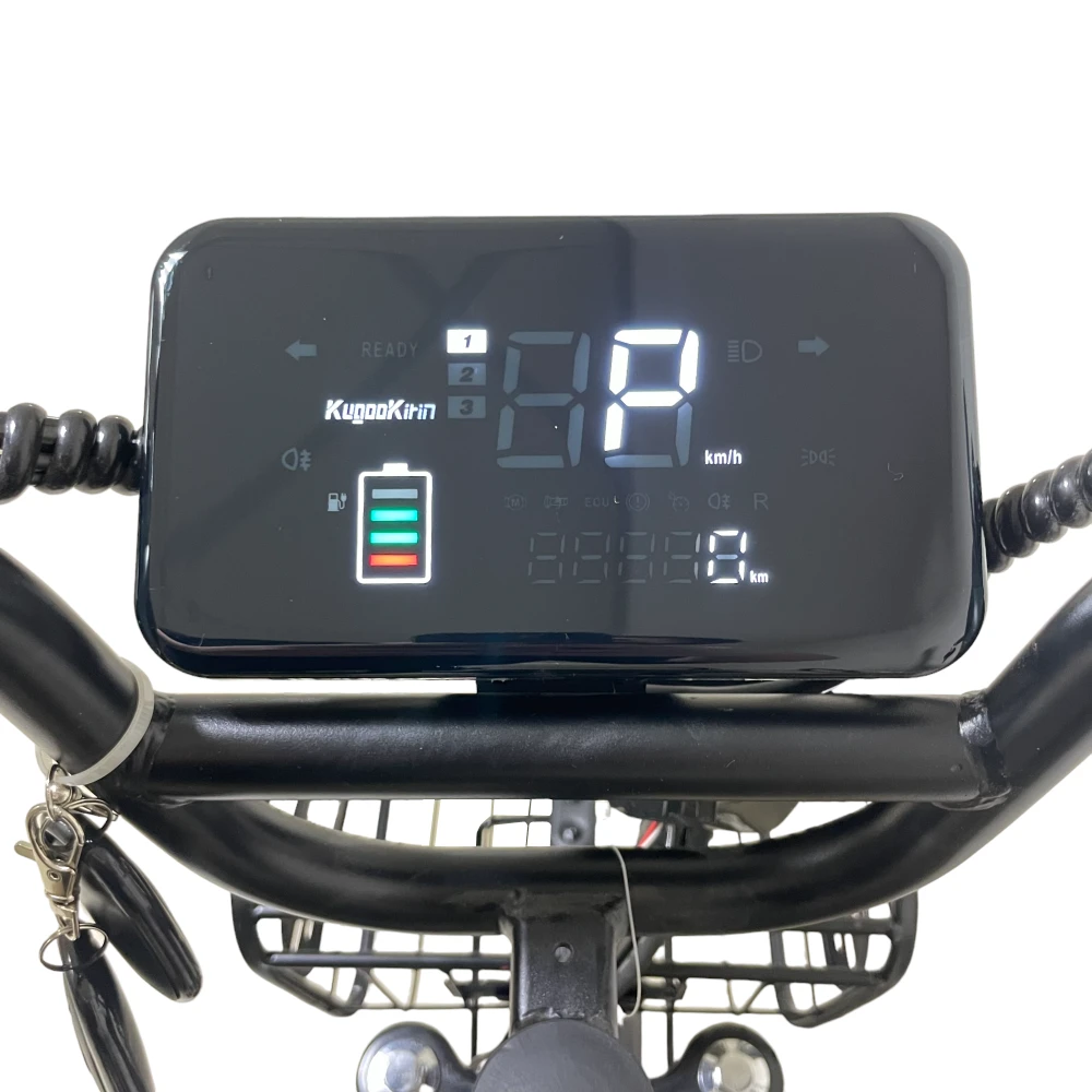 Главное преимущество — аккумулятор 28.6 Ah (60V), обеспечивающий до 80 км на одном заряде. Время зарядки — до 9 часов.