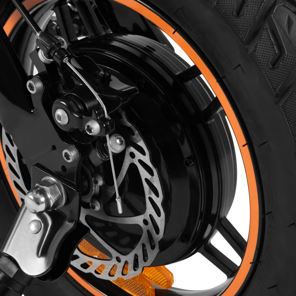 Надёжные дисковые тормоза гарантируют безопасность на любой скорости, а 14-дюймовые колёса обеспечивают устойчивость и уверенный ход. LED-фонарь освещает дорогу в тёмное время суток, а подножка добавляет удобства при парковке.