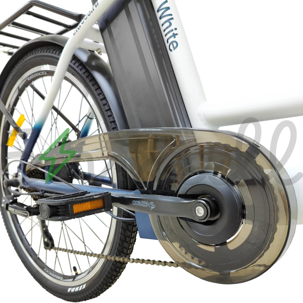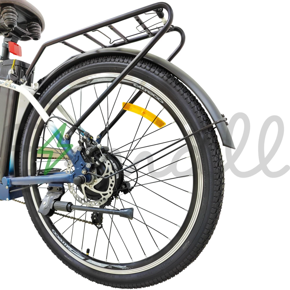 Рама изделия усовершенствована. Стала максимально легкой благодаря изящному алюминию. Рулевая часть велогибрида оснащена LCD-велокомпьютером Eltreco M3, благодаря которому удобно отслеживать скоростные характеристики, заряд АКБ и другие параметры.