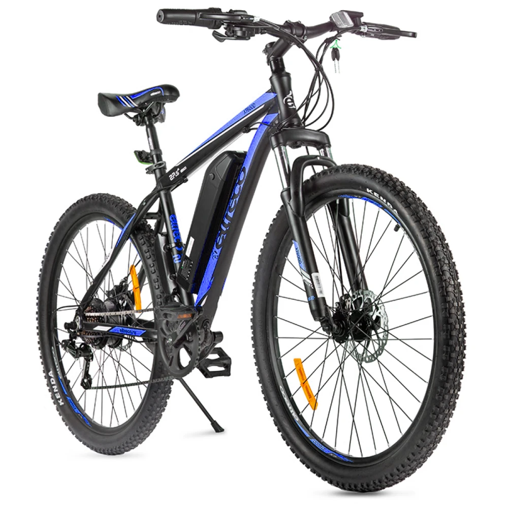 Велогибрид Eltreco XT 600 – доступная и востребованная на рынке электровелосипедов модель. В сравнении с предыдущими вариантами имеет облегченную алюминиевую раму, сглаженную геометрию, в которой нельзя найти острых углов. черно-синяя модель велосипеда сочетает в себе роскошь и многофункционал. Общий вес велика – 20 кг. При разработке модели производитель использовал оригинальные брендовые запчасти, что сделало срок службы техники длительным. Технические особенности электровелосипеда следующие: