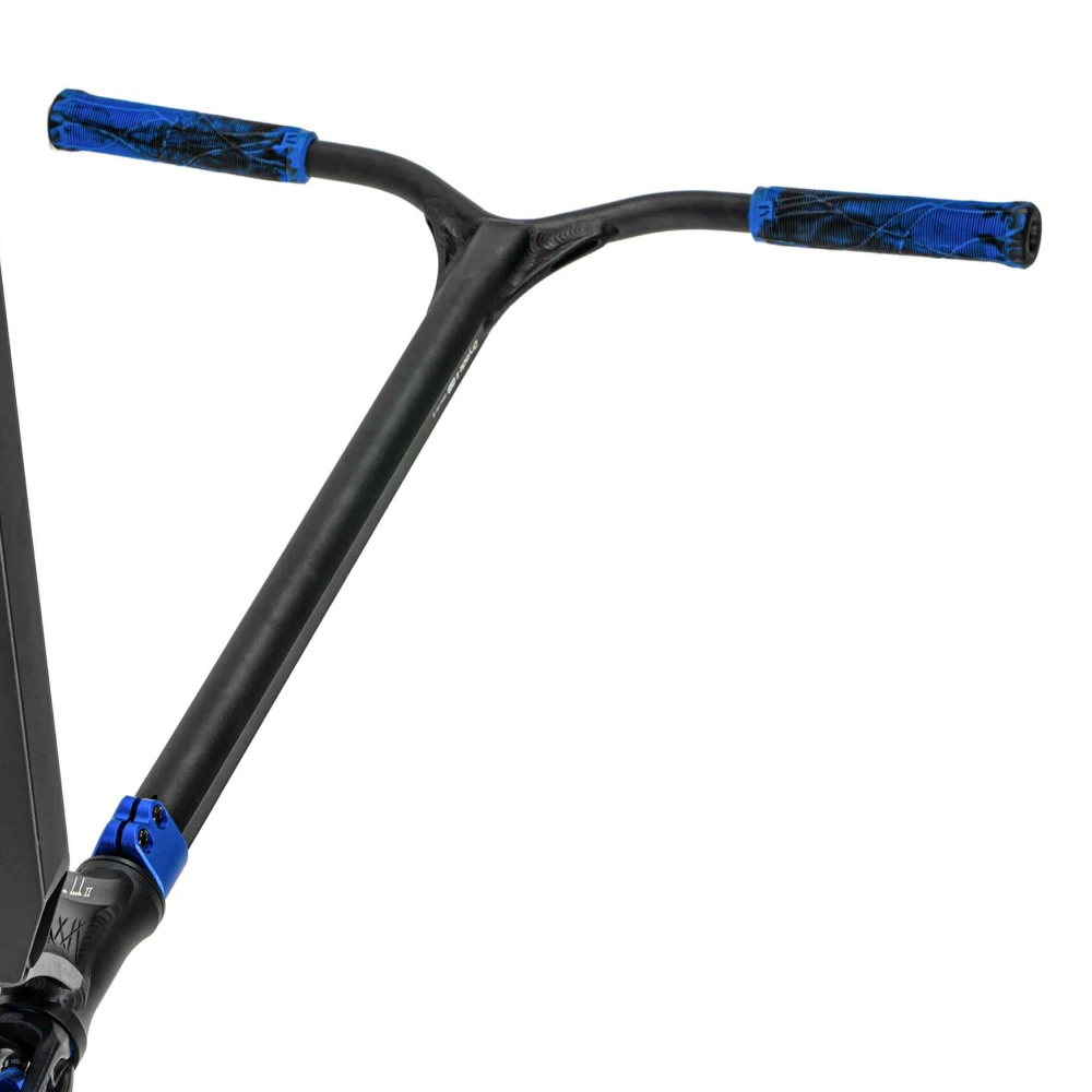Высота руля 620 мм и его Y-образная форма идеально подходят для райдеров ростом от 140 до 165 см, обеспечивая оптимальный контроль. Алюминиевая дека шириной 120 мм и длиной 500 мм предлагает надежность и устойчивость, которые вы оцените во время выполнения сложных трюков. Синий цвет на грипсах, дисках и хомуте придает самокату яркий и запоминающийся вид, делая его неотъемлемой частью вашего уникального стиля.