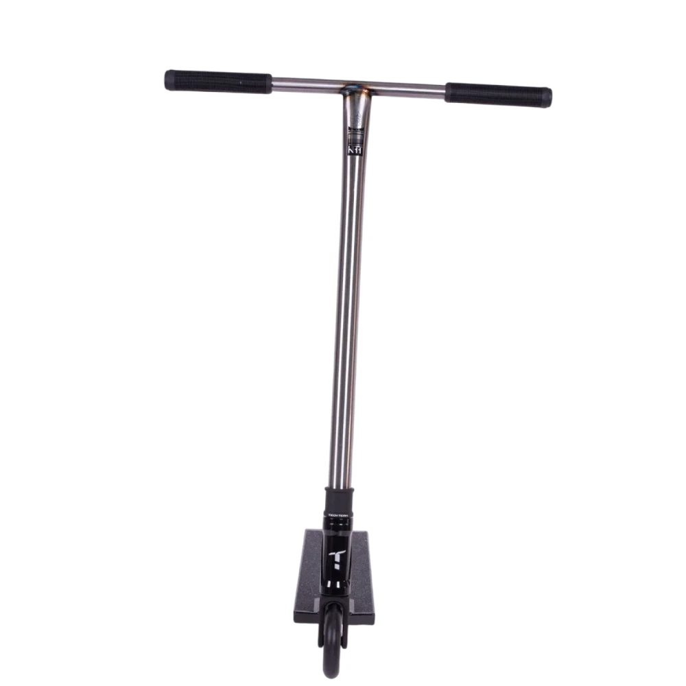 Вилка также выполнена из сплава AL6061 с анодированием и фирменной гравировкой «Т», что подчёркивает внимание к деталям. Колёса размером 110×24 мм оснащены полиуретановым покрытием SHR жёсткостью 88А, что обеспечивает идеальный баланс между скоростью и контролем. Алюминиевый диск колеса делает их лёгкими и устойчивыми к износу. Подшипники класса ABEC-9 гарантируют высокую скорость и долговечность. Пластиковый тормоз надёжен и прост в использовании, позволяя контролировать движение.