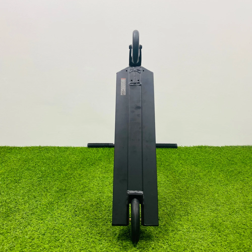 Широкая алюминиевая дека стала намного удобнее для езды за счет своего размера 14*56*41 см. Классическими остались и заваренные скошенная передняя ее сторона и квадратная задняя. Новинкой в этой модели является фендер, который защищает самокат от непреднамеренного торможения. Привычный стальной тормоз тоже не стали убирать. Алюминиевая фрезерованная вилка соединяется с высоким рулем системой SCS-компрессии с четырех болтовым зажимом на болтах-"шестерках”. Вращения колес обеспечивает подшипник ABEC 9 Chrome. А сами колеса выполнены из полиуретана с дисками из алюминия.
